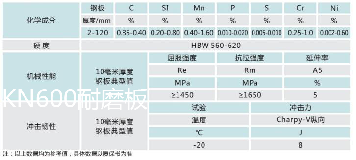 圖(1)高強(qiáng)度耐磨板KN600的材質(zhì)參數(shù)