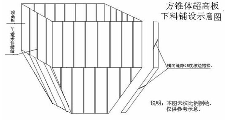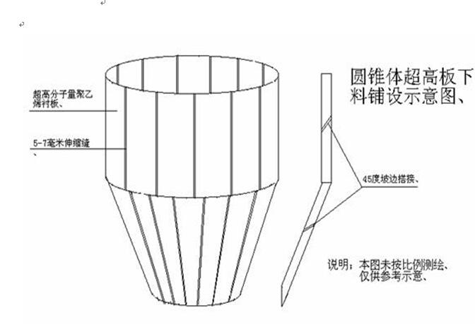 圓錐體;下料時其形狀為梯形、上寬數(shù)據(jù)=圓錐體上口周長÷所需防粘耐磨襯板塊數(shù)。下寬數(shù)據(jù)=圓錐體下口周長÷所需防粘耐磨襯板塊數(shù)。在倉體內(nèi)鋪設(shè)防粘耐磨襯板時,豎向縫隙應(yīng)留5-7毫米伸縮縫隙、橫向縫隙45度坡邊搭接。如圖所示;
