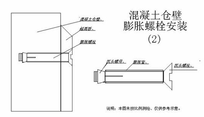 本安裝方法實用于混凝土煤倉、料斗、地溝等。安裝時首先用射丁器、將防粘耐磨襯板固定在混凝土倉壁上、然后、用電鉆將防粘耐磨襯板打通、再用電錘在混凝土壁上打合適深度 的洞眼、在防粘耐磨襯板上擴、螺栓沉頭部分型壯的洞眼、然后、穿入膨脹螺栓、用內(nèi)六方扳手、旋轉(zhuǎn)沉頭螺栓、使內(nèi)端的沉頭螺母將膨脹管膨大旋緊為止。請參考