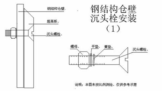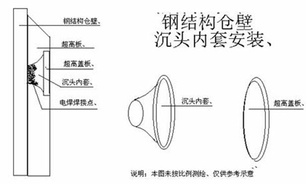 本安裝方法實用于鋼結(jié)構(gòu)煤倉、料斗、溜槽等。安裝時首先用射釘器、將防粘耐磨襯板固定在鋼板上,然后、用電鉆將防粘耐磨襯板、鋼板一并打通、再在防粘耐磨襯板上擴、螺栓沉頭部分型壯的洞眼,最后、穿入沉頭螺栓、從煤倉外用平墊、簧墊、螺母旋緊為止。請參考